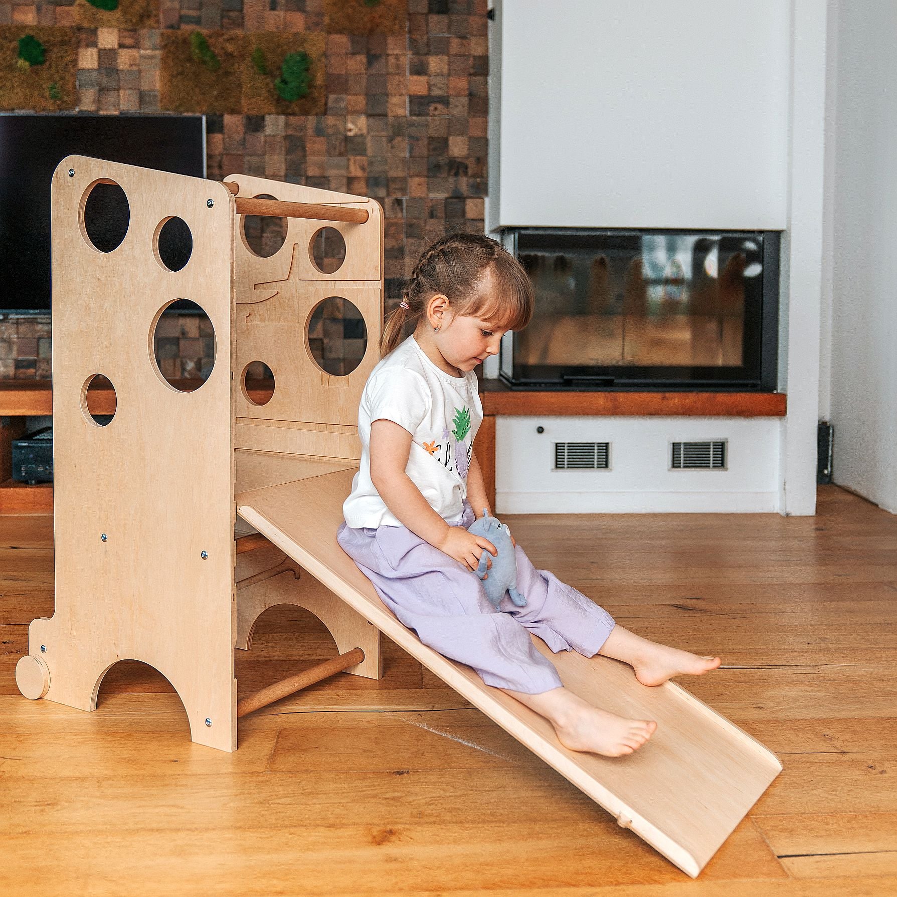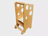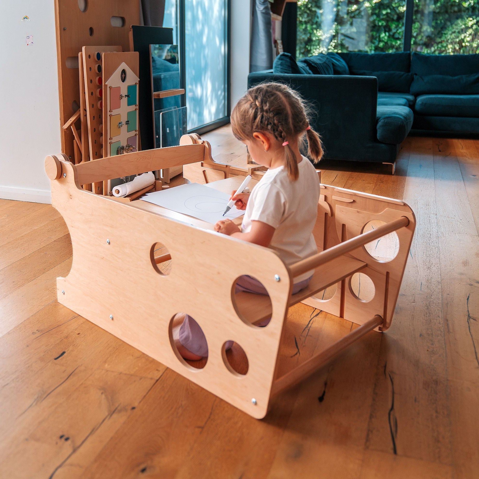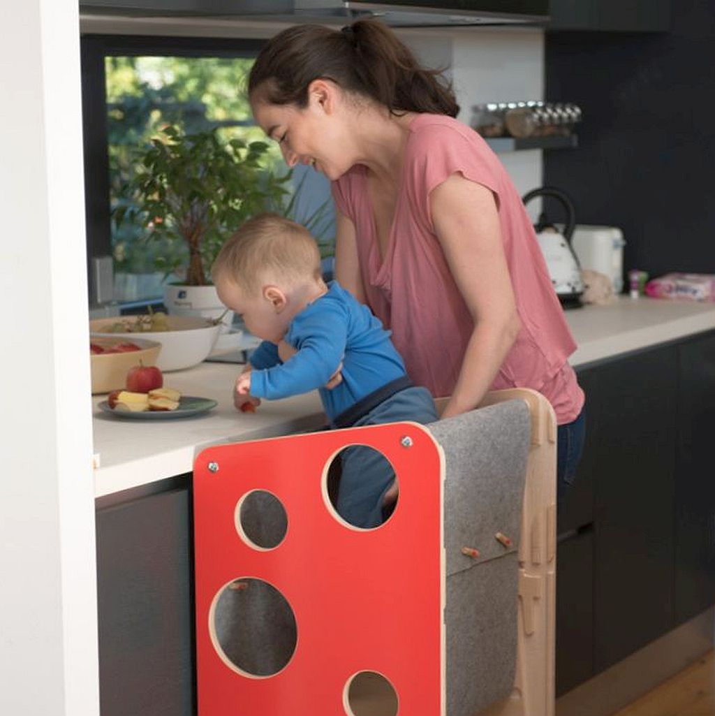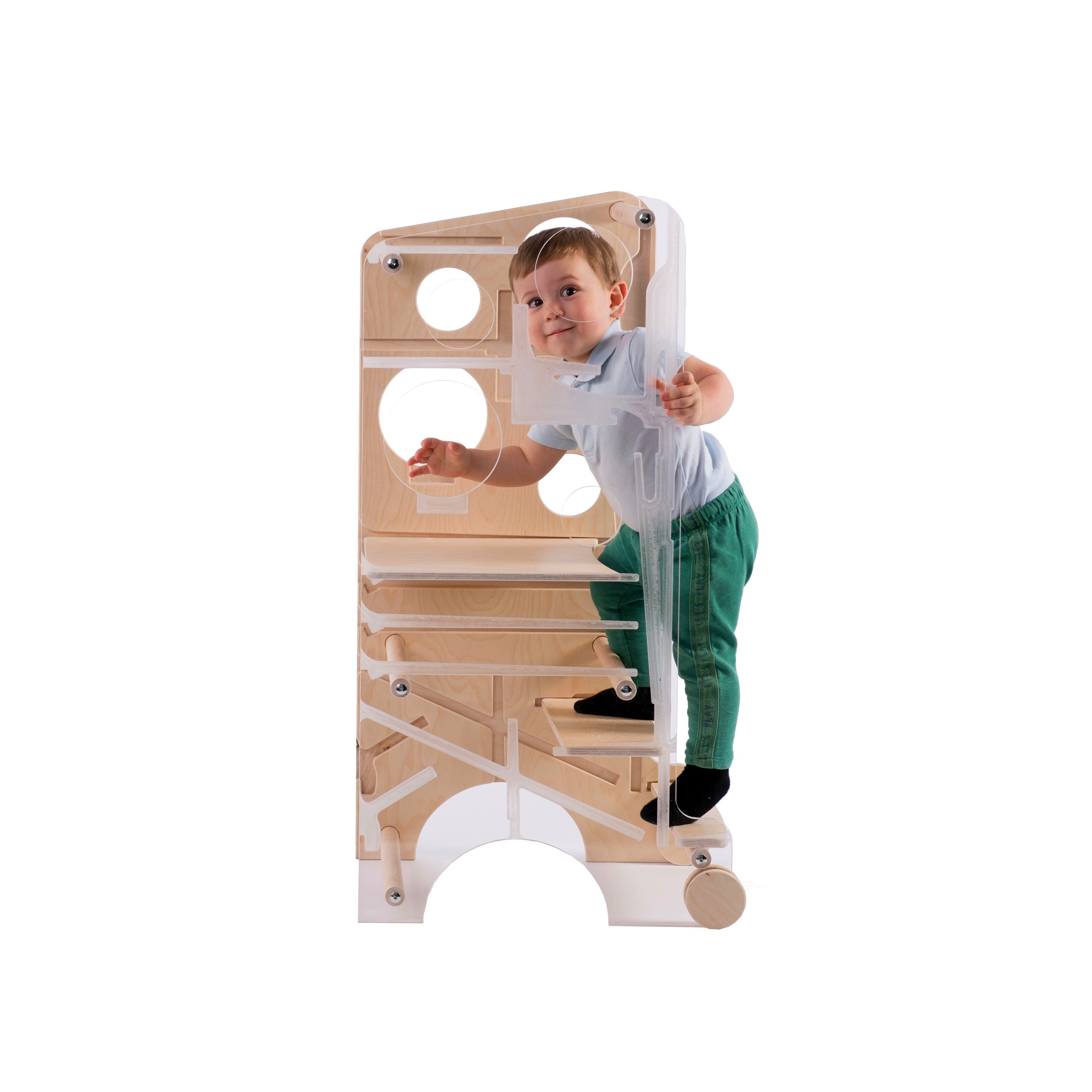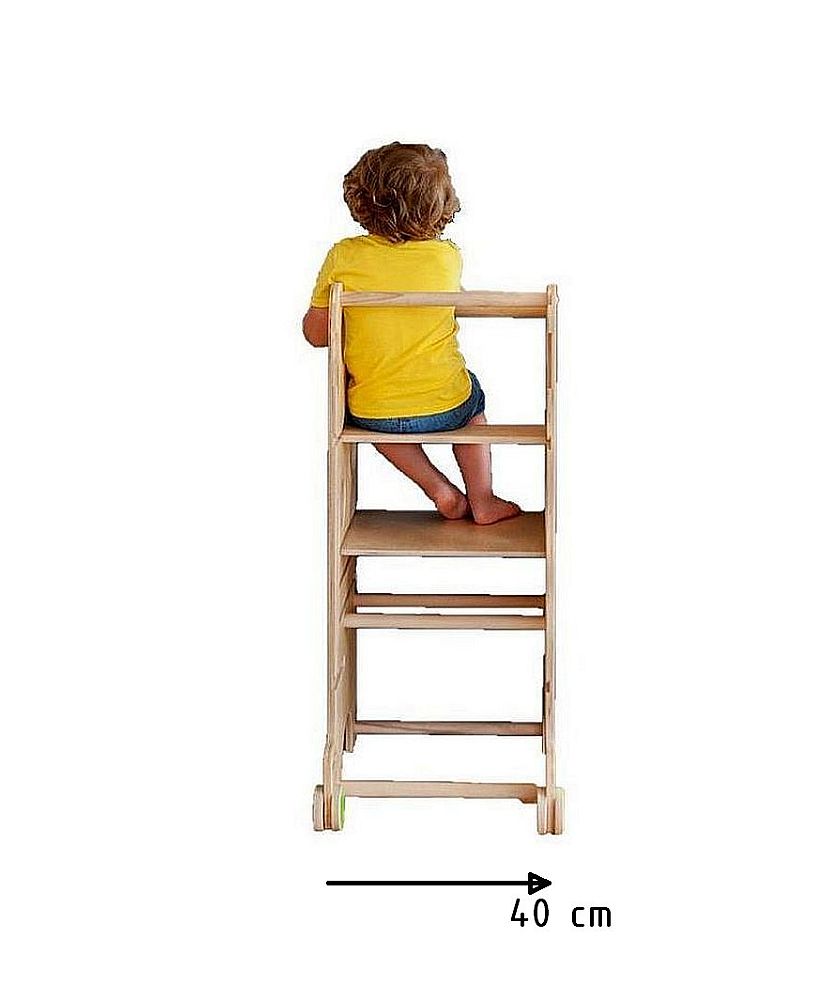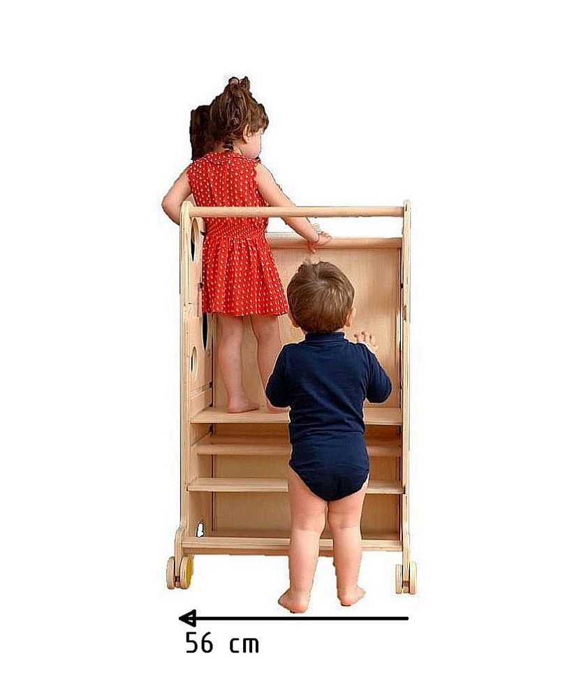 Der Turm lässt sich in nur wenigen Sekunden in einen Mini-Schreibtisch umwandeln. Er ist groß genug, um sogar zwei Kinder gleichzeitig Platz zu bieten, und die Tischplatte kann für zusätzlichen Komfort geneigt werden. Unter der Tischplatte kann eine Papierrolle angebracht werden – ideal zum Zeichnen oder für kreative Aktivitäten.