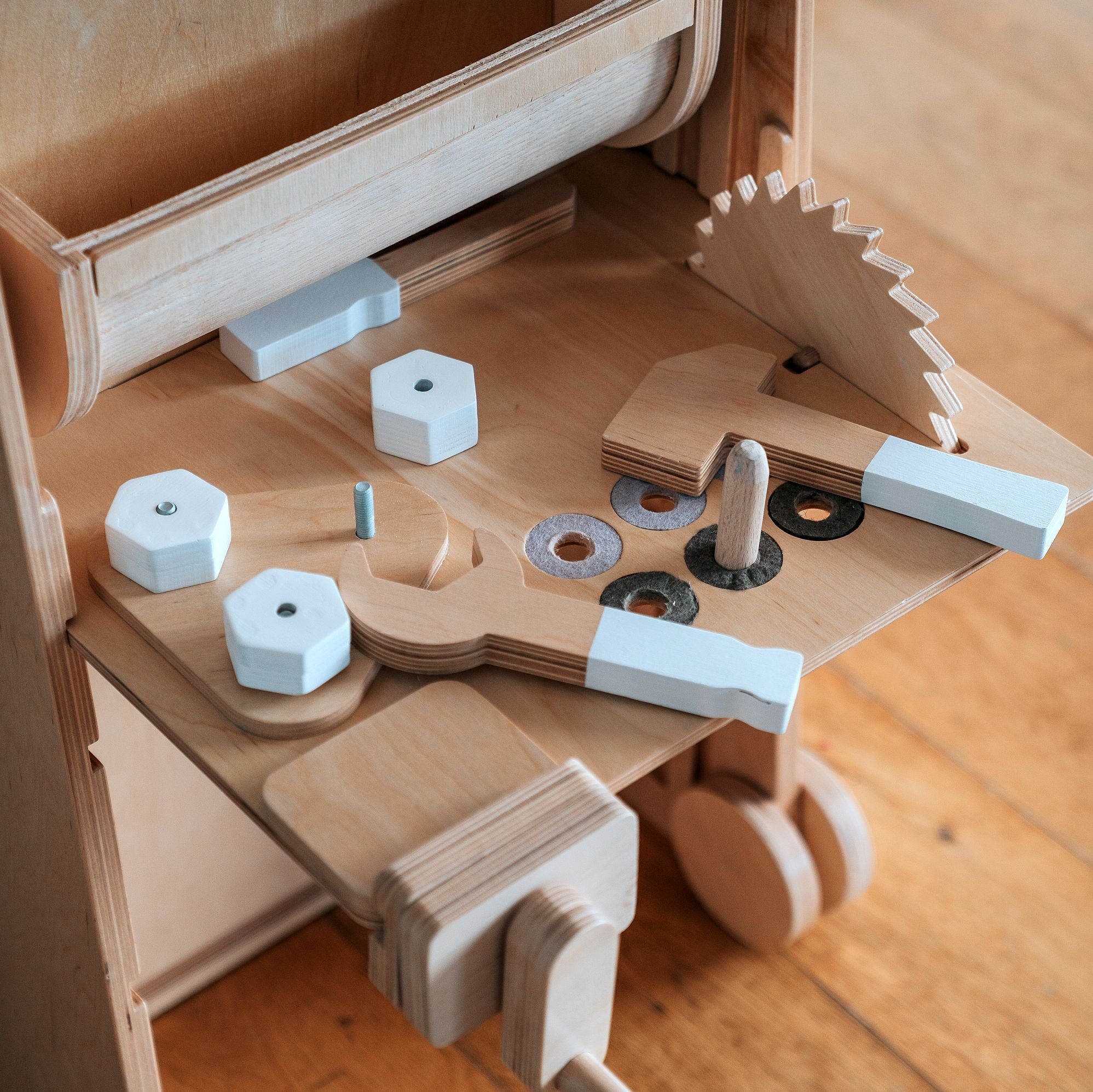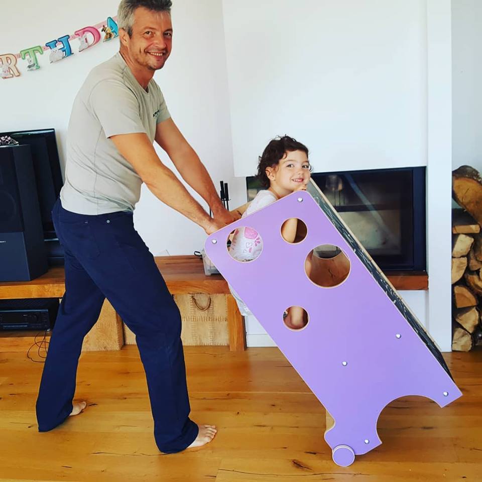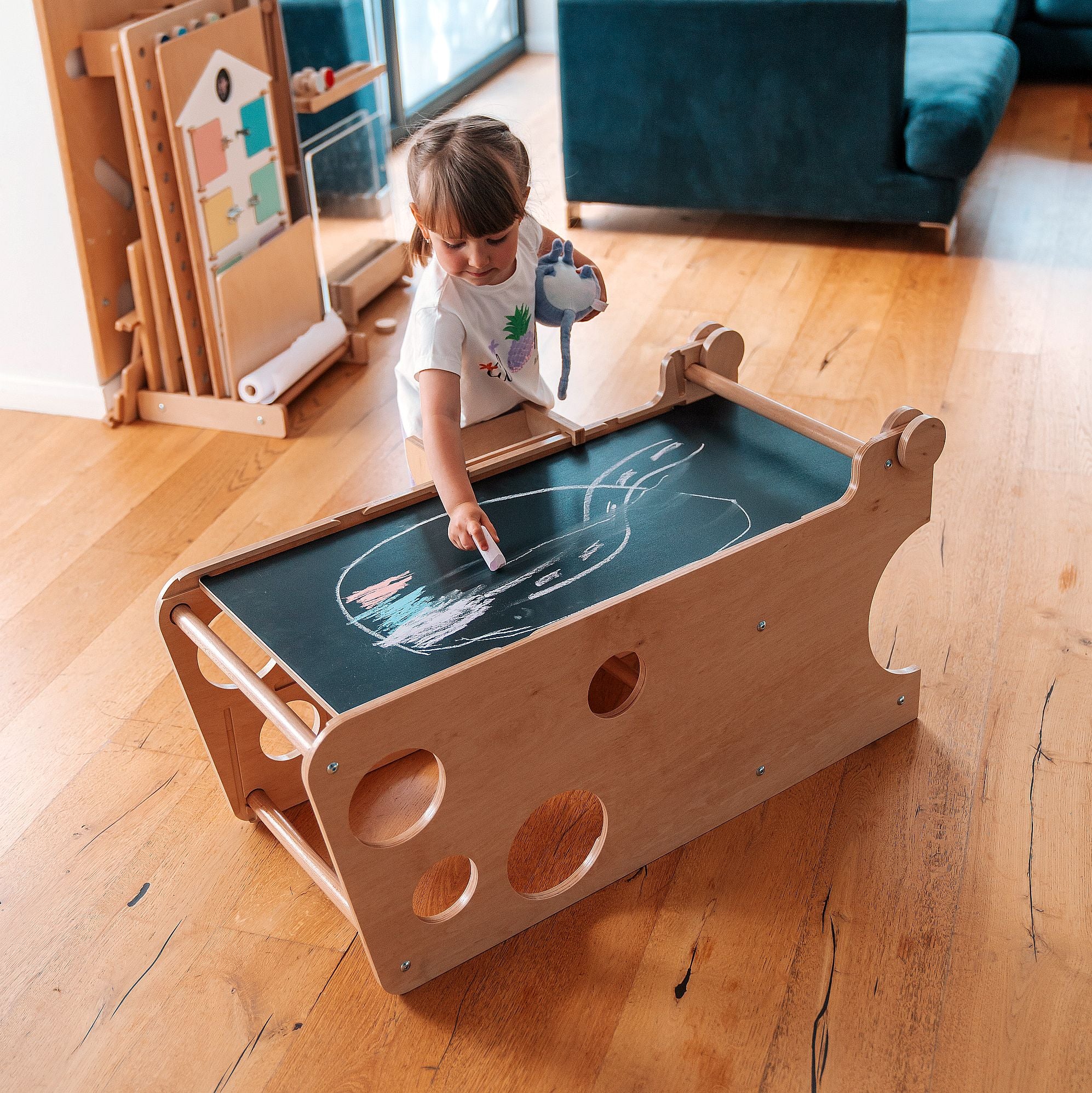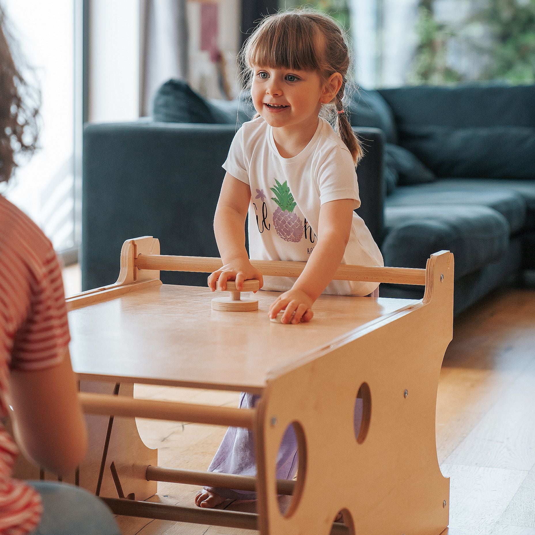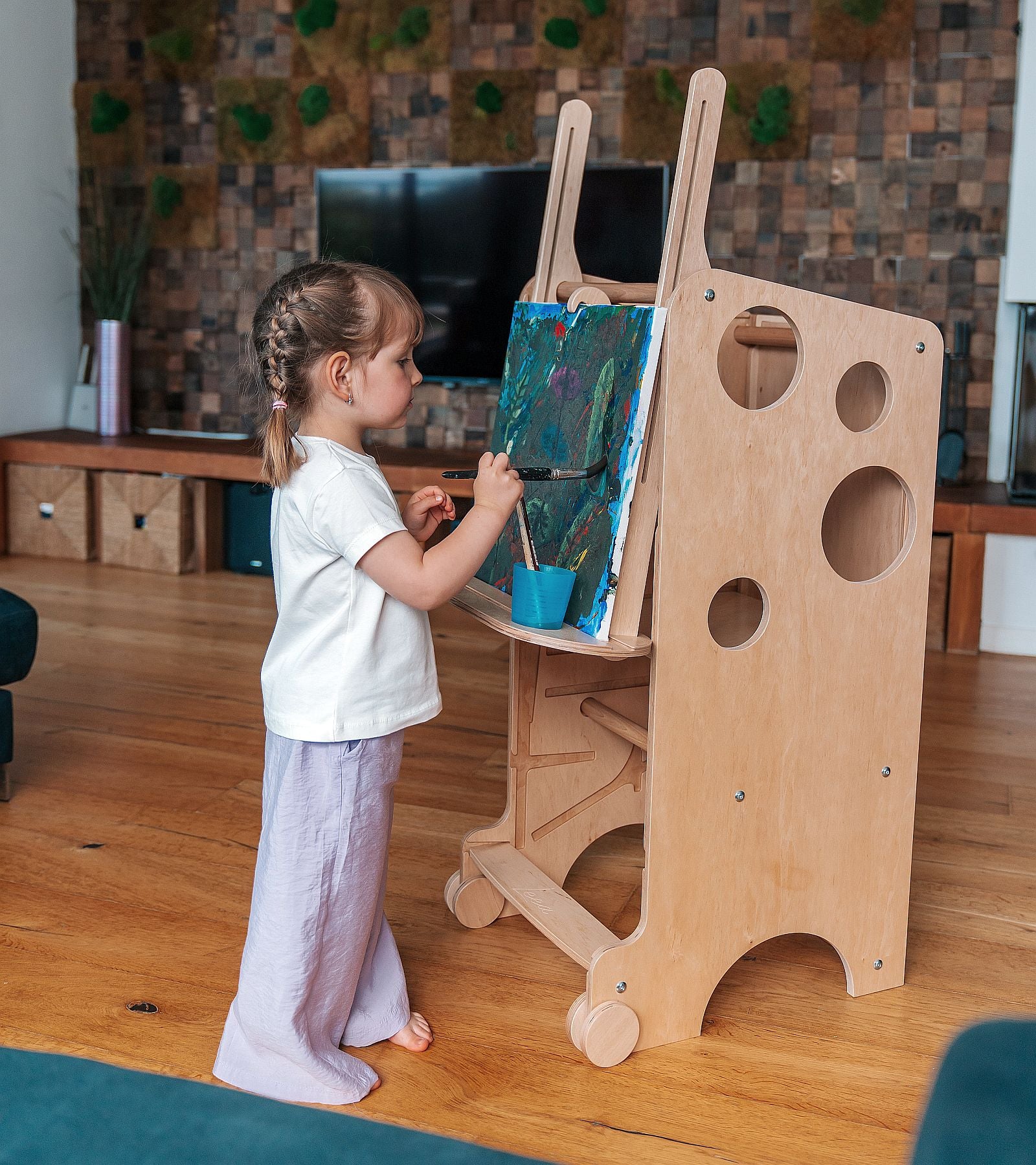 Der Turm lässt sich in nur wenigen Sekunden in einen Mini-Schreibtisch umwandeln. Er ist groß genug, um sogar zwei Kinder gleichzeitig Platz zu bieten, und die Tischplatte kann für zusätzlichen Komfort geneigt werden. Unter der Tischplatte kann eine Papierrolle angebracht werden – ideal zum Zeichnen oder für kreative Aktivitäten.
