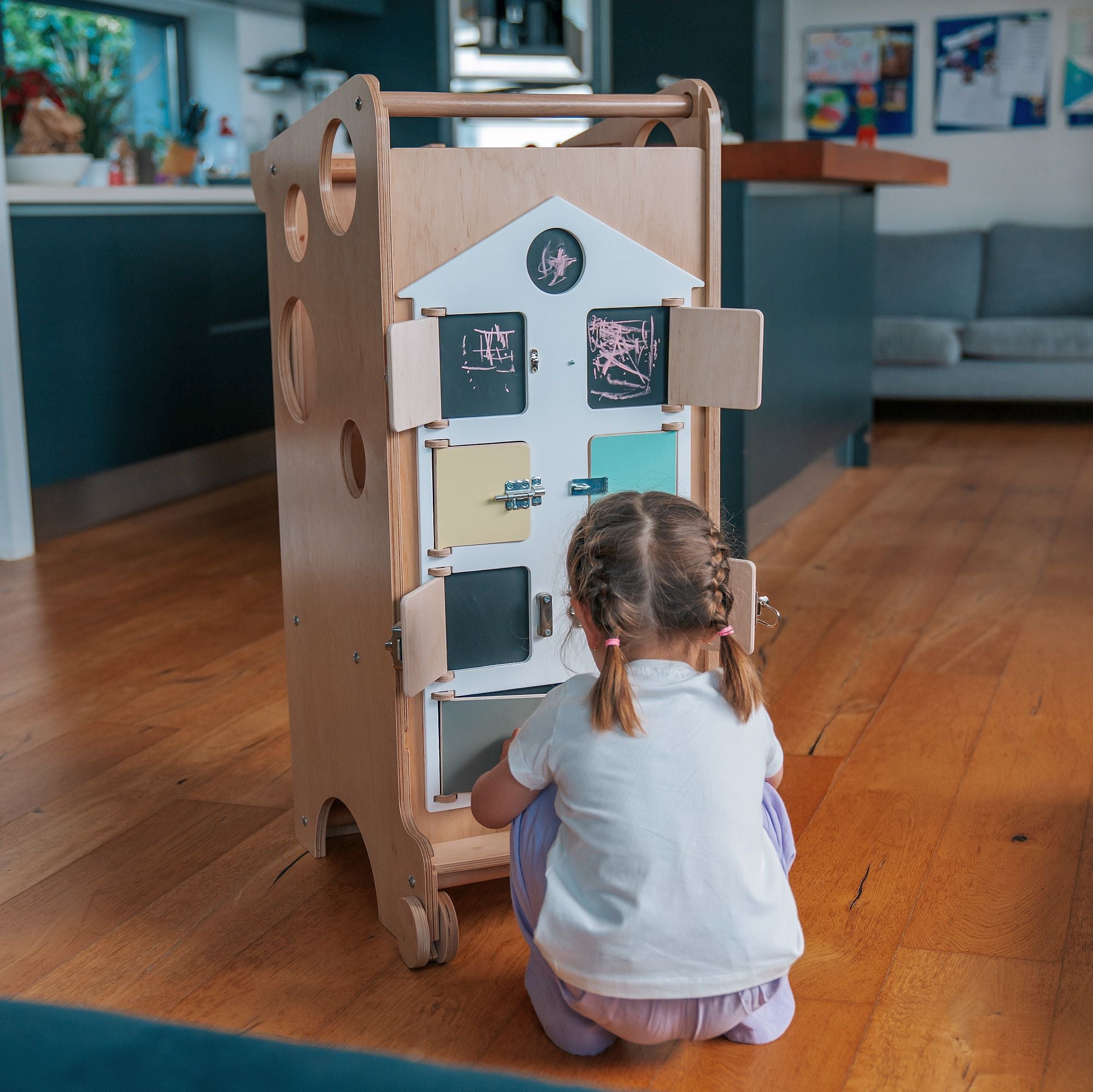 Dank der Räder lässt sich der Turm ganz leicht durch das ganze Haus bewegen.